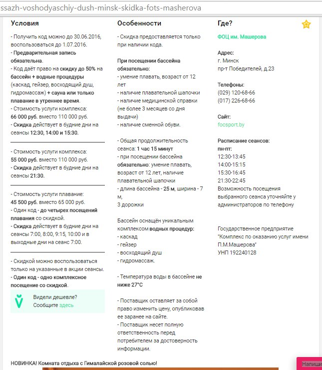 Очень хороший комплекс процедур и приветливый персонал бассейна! Спасибо за акцию!