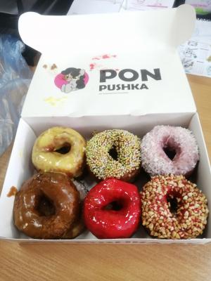 *Вкусы глазури и посыпки на пончиках в боксе выбираются случайным образом исходя из наличия в момент формирования заказа.