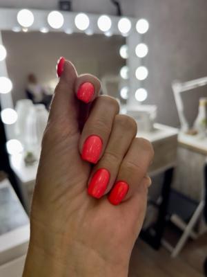 Описание процедуры: снятие старого долговременное покрытия фрезой, придание формы ногтям, гигиеническая обработка кутикулы и боковых валиков аппаратным способом с использованием абразивных стерильных фрез, или комбинированным способом (фрезы + ножнички/кусачки), однотонное покрытие ногтей гель-лаком, масло для кутикулы, массаж кистей с кремом для рук