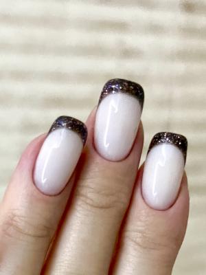 - снятие старого покрытия фрезой, придание формы ногтям, гигиеническая обработка кутикулы и боковых валиков аппаратным способом с использованием абразивных стерильных фрез, или комбинированным способом (фрезы + ножнички/кусачки), однотонное покрытие ногтей гель-лаком, масло для кутикулы