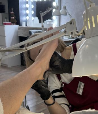 - обработка кожи стоп: гигиеническая обработка ороговевших участков кожи стопы аппаратным способом (шлифовочные колпачки или файлы для диска различной абразивности) или препаратно-аппаратным способом - шлифовка кожи стопы после предварительного размягчения профессиональным кератолитическим средством, массаж стоп с кремом для ног