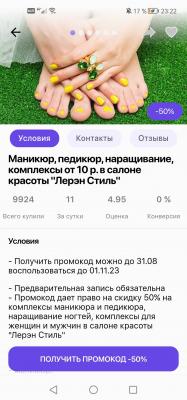 - Промокод дает право на скидку до 53% на комплексы маникюра и педикюра, наращивание ногтей, комплексы для женщин и мужчин в салоне красоты "Лерэн Стиль"