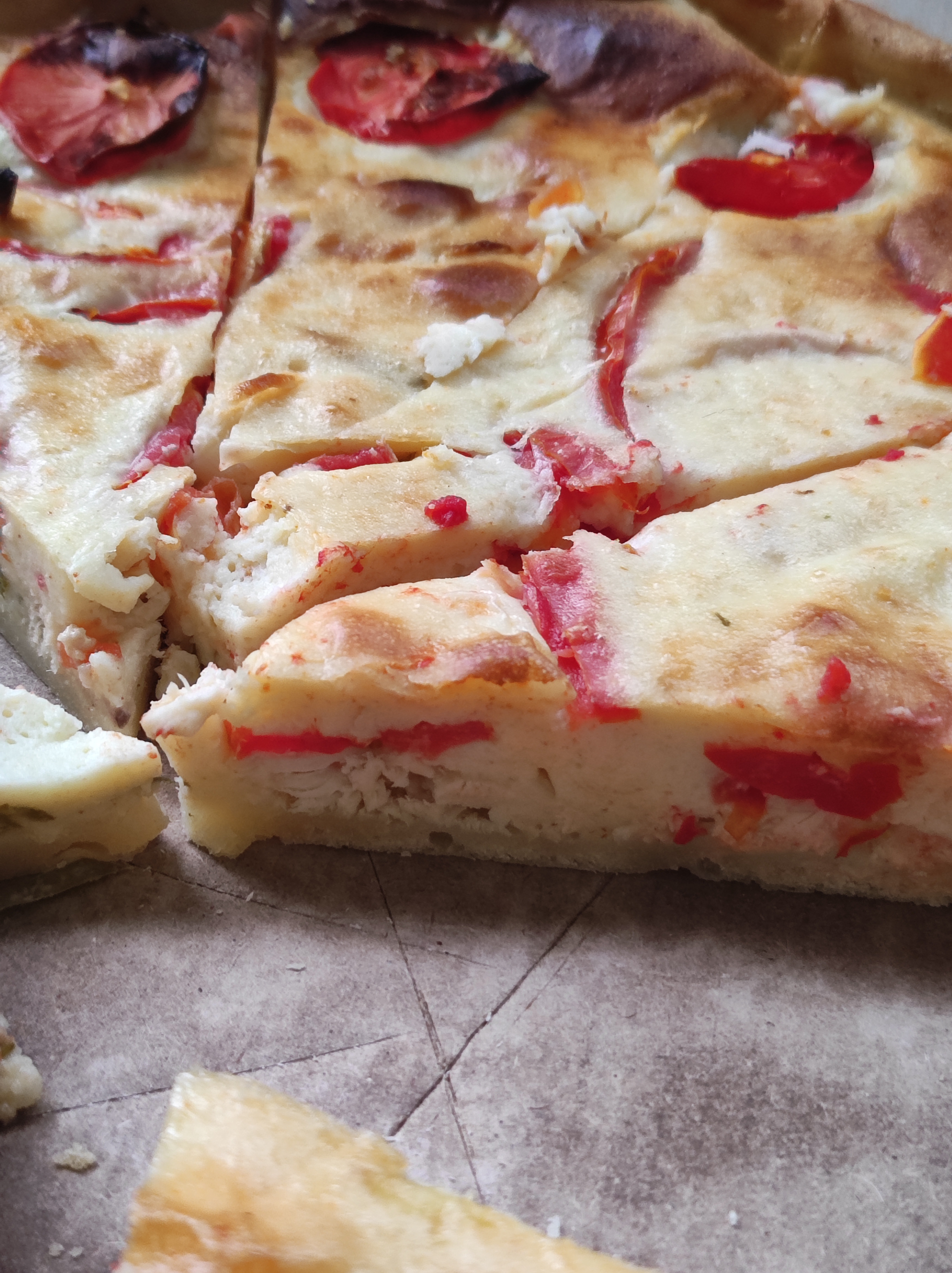 - открытый пирог с курицей, базиликом и томатом: фирменное песочное тесто, грудка куриная, базилик, томат, соль, перец, чеснок, яйцо, сыр творожный, сливки
