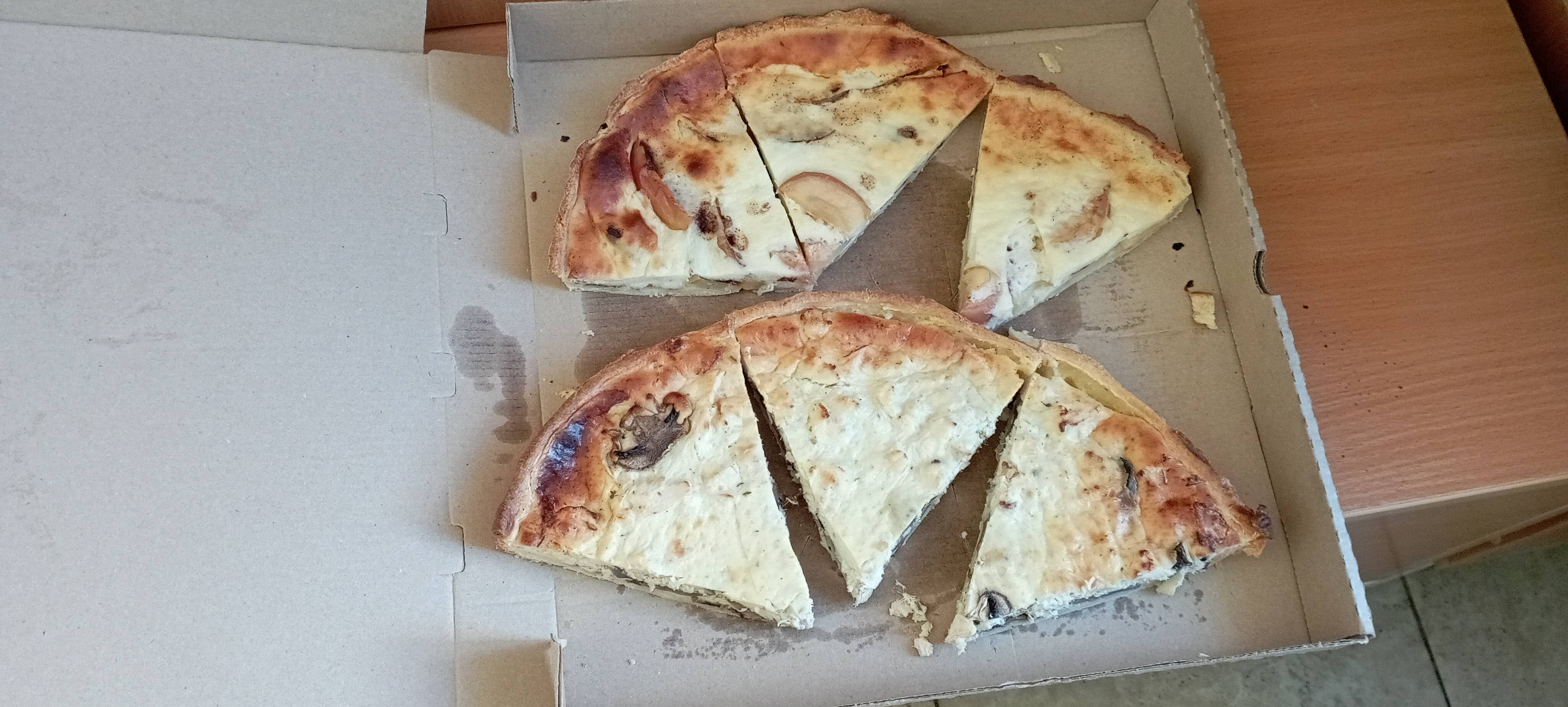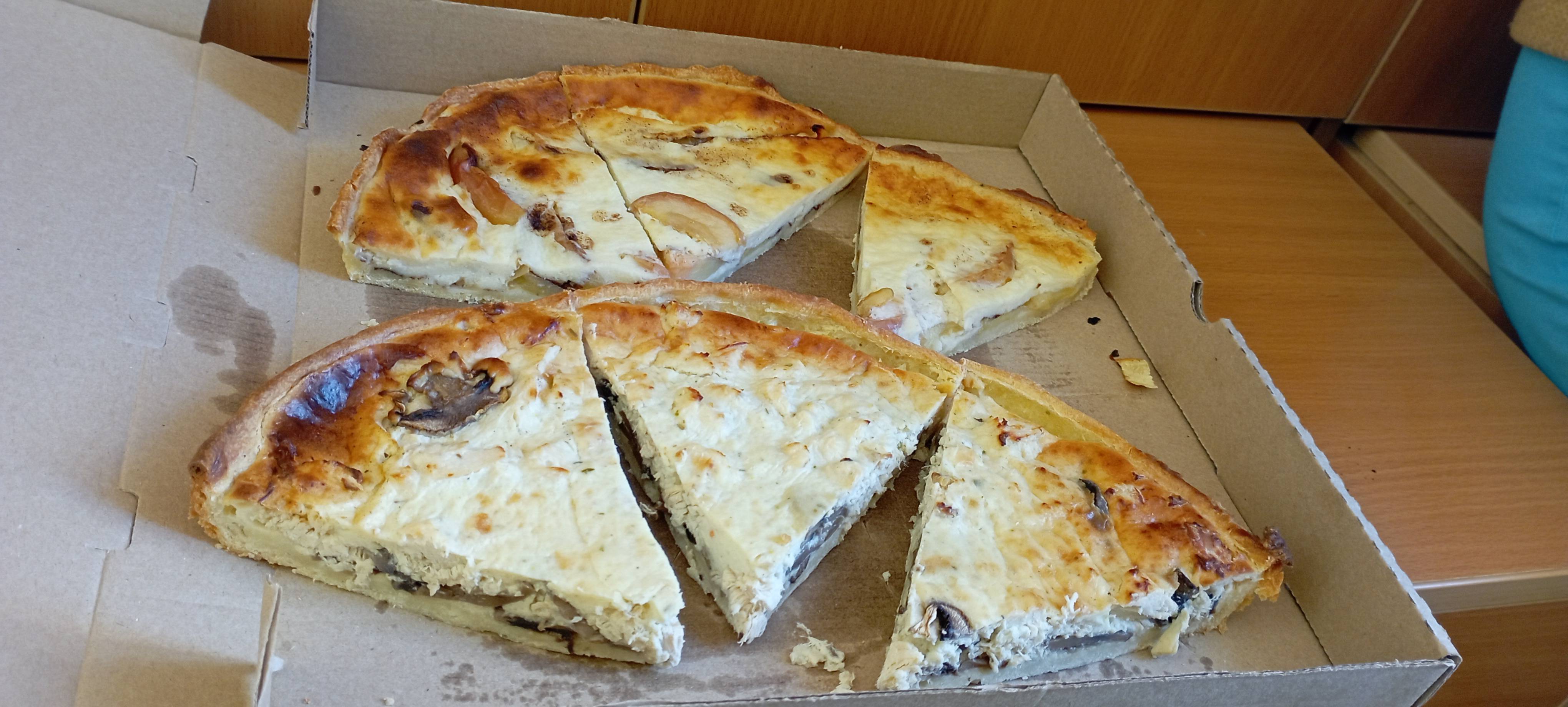 - открытый пирог с ветчиной и грибами: фирменное песочное тесто, ветчина куриная, ветчина свиная, грибы шампиньоны, соль, перец, чеснок, яйцо, сливки, сыр творожный