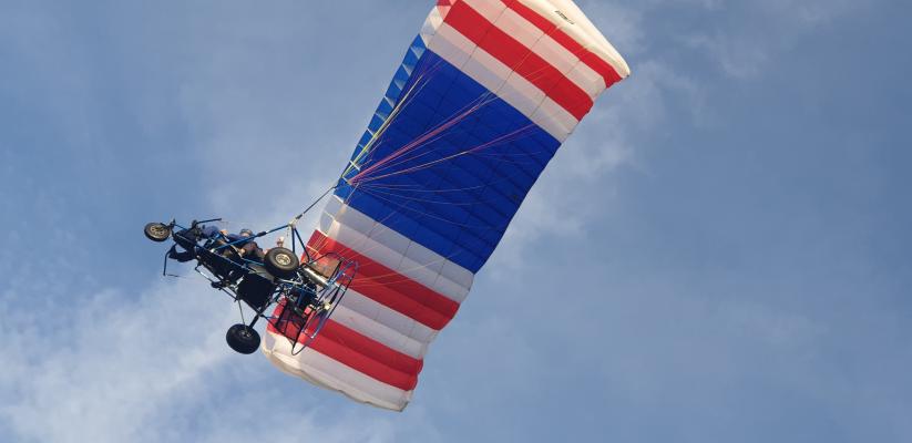 Аэрошют - это тележка с мотором, винтом и парашютом. Грузоподъемность аппарата составляет 450 кг, это значит, что пилоту не грозит одиночество, аппарат поднимет в небо пассажира до 100 кг. Скорость полета невелика 50 км/ч, а высота - от "бреющего" в одном-двух метрах от земли до заоблачных. Продолжительность полета от 10 минут до 1 часа.