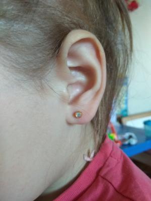 Застежка серьги-иглы закрывается так, что полностью исключается "зажим" мочки уха Рана получается колотой, а разрывы исключены. Это означает, что процесс заживления происходит без проблем.