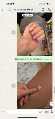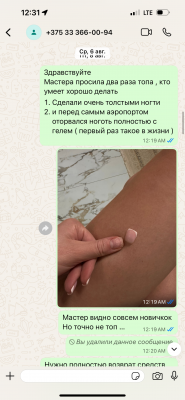 Делаю маникюр около 10 лет в разных салонах , но с таким ужасом сталкиваюсь впервые . Ни ногой к мастеру Дарье. Грубая хамка , даже не извинилась и еще пришла и нагрубила. Ногти после нее отваливаются на 2 день , полностью пластиной как будто приклеены клеем . Все на фото. Сервис ужас , ни извинений , одна грубость, хамство , абьюз , салон как на базаре, начиная от ресепшена заканчивая мастером .