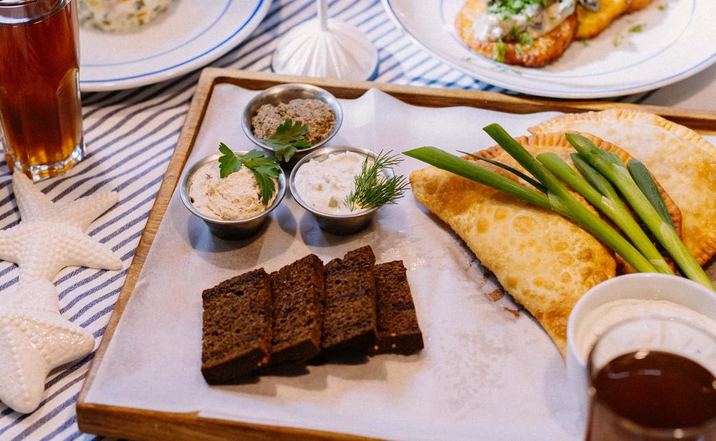 - намазка из шпрот с зеленым луком, грибная намазка с творожным сыром, намазка из творога с маринованным огурцом и чесноком, поджаренный на мангале хлеб