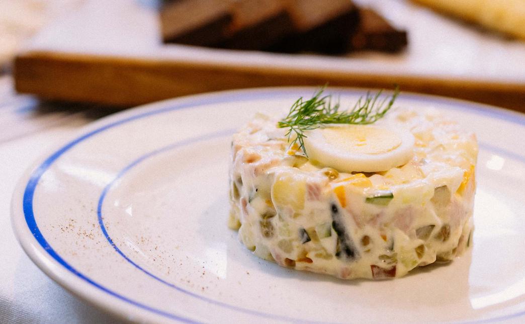 - традиционный салат с одесским акцентом, готовим его с ветчиной, свежими и маринованными огурцами, подаем с долькой отварного яйца и укропом