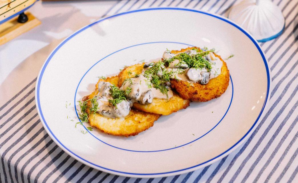 - хрустящие картофельные оладьи под нежным сливочно-сметанным соусом с грибами шампиньонами и укропом