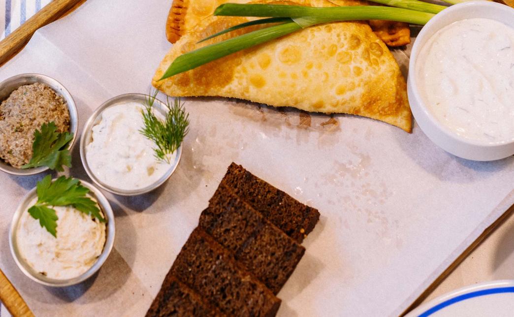 - чебурек с курицей, чебурек с говядиной и свининой, чебурек с сыром сулугуни и укропом, с соусом "Дзадзыки", зеленый лук