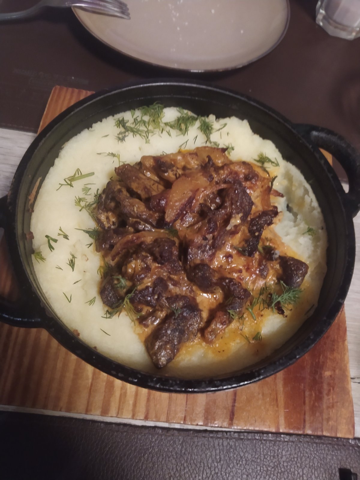 - Бефстроганов из говядины с запеченным картофелем с хрустящим жареным луком: картофель, вырезка говяжья, сливки, томатная паста, лук репчатый
