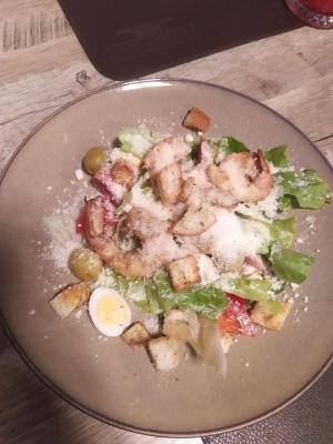 - Салат Цезарь с тигровыми креветками: тигровые креветки, салат микс, соус цезарь, томаты черри, сухарики, сыр пармезан, маслины
