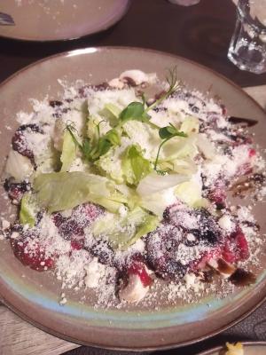 - Тар тар из говядины с копченым соусом, пармезаном и тартильей: тар тар (говядина, каперсы, лук, огурец маринованный, перец халапеньо) из говядины, соус копченый из шпрот, сыр пармезан, тартилья