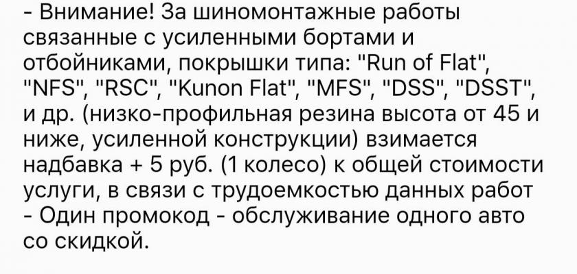 - Внимание! За шиномонтажные работы связанные с усиленными бортами и отбойниками, покрышки типа: "Run of Flat", "NFS", "RSC", "Kunon Flat", "MFS", "DSS", "DSST", и др. (низко-профильная резина высота от 45 и ниже, усиленной конструкции) взимается надбавка + 5 руб. (1 колесо) к общей стоимости услуги, в связи с трудоемкостью данных работ
