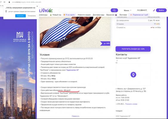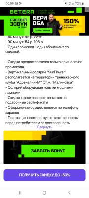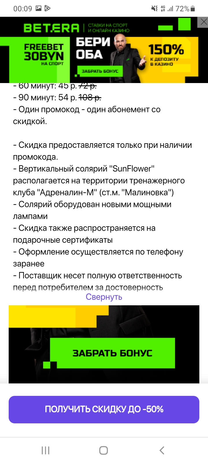 - Промокод дает право на скидку до 50% на абонементы в вертикальный солярий "SunFlower" для новых клиентов в тренажерном зале "Малина Джим"