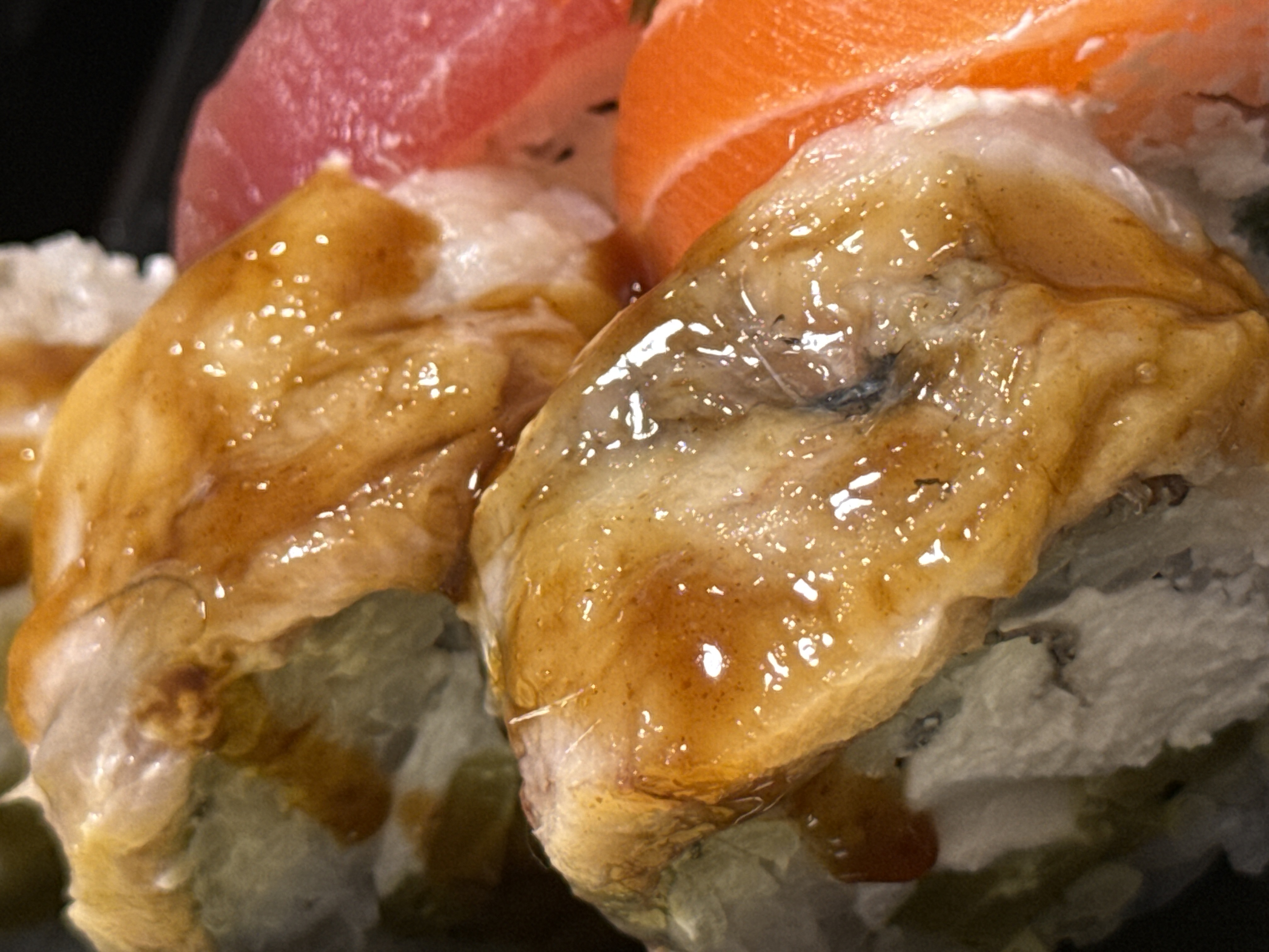 Состав: филе угря, авокадо, огурец, сыр, рис, соус терияки, кунжут