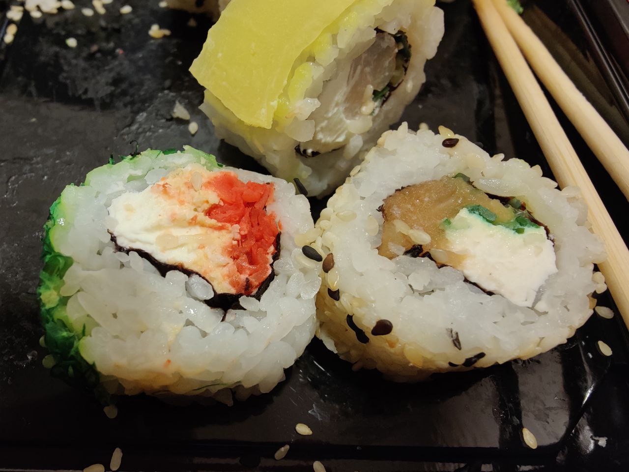 Состав: филе угря, авокадо, огурец, сыр, рис, соус терияки, кунжут