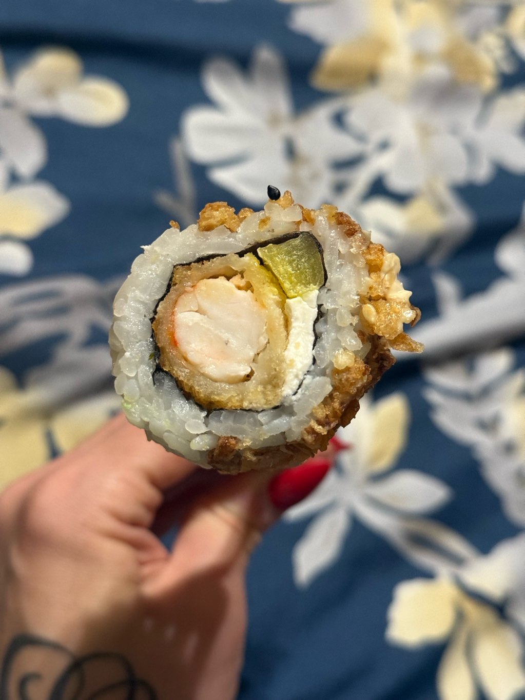 - ролл с окунем темпура, огурцом, сыром Чеддер, соусом Фьюжн, кранч луком