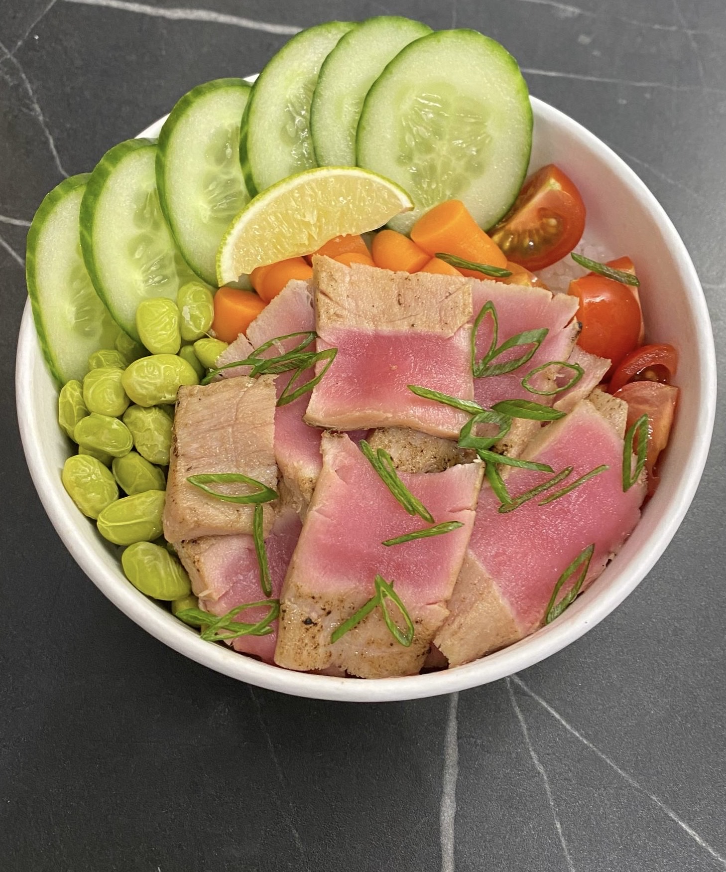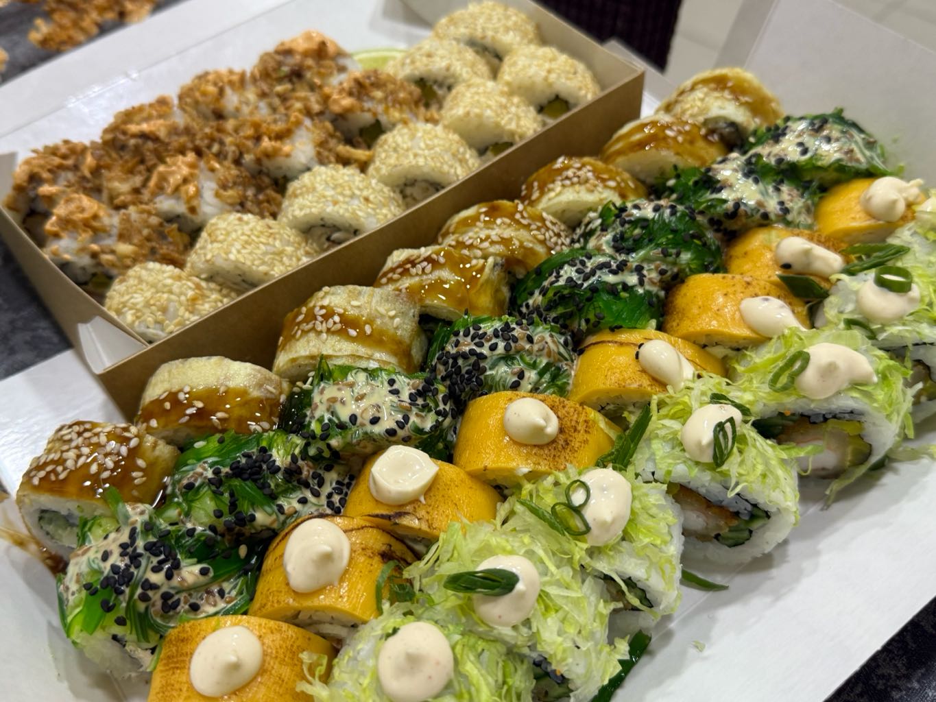 - ролл с опаленный тунцом, сливочным сыром, томатом, салатом айсберг, соусом фьюжен и кранч луком