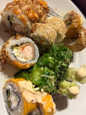 - ролл со сливочным сыром, жареным лососем, салатом айсбергом, соусом спайси, соусом фьюжен и кранч луком