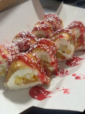 - ролл в опаленном морском окуне, салатом айсберг, сыром, яблоком и сладким соусом чили