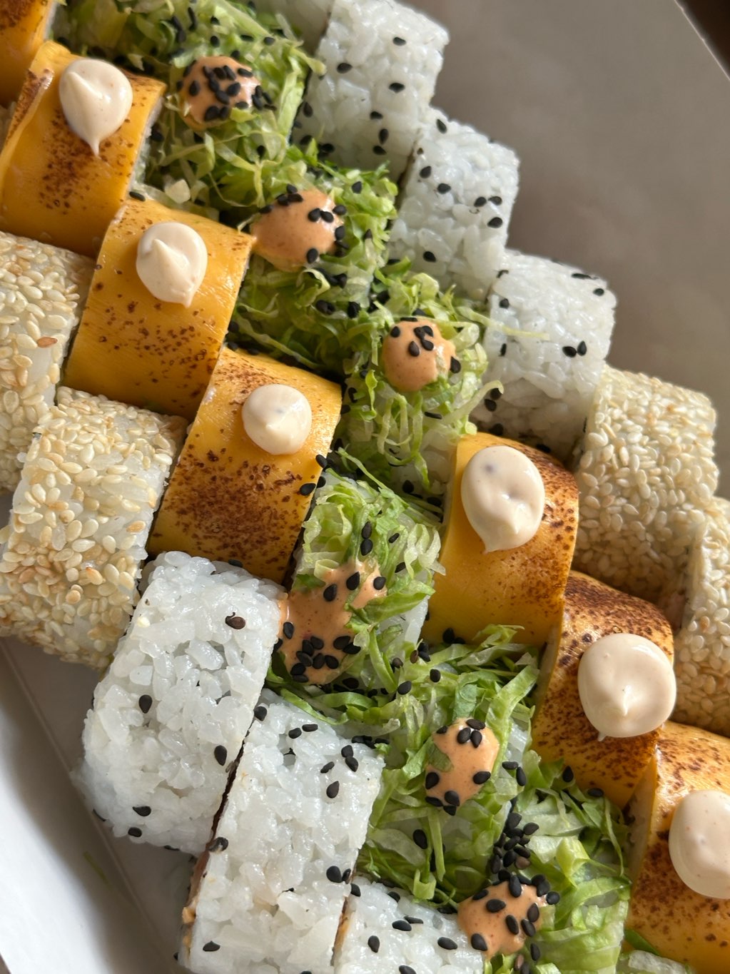 - ролл с опаленный тунцом, сливочным сыром, томатом, салатом айсберг, соусом фьюжен и кранч луком