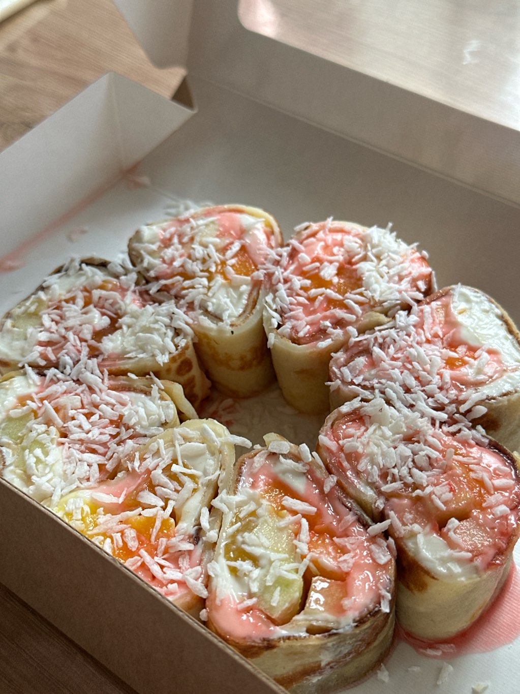 - ролл с лососем, апельсином, сливочным сыром, соусом фьюжн и дробленым фисташковым орехом