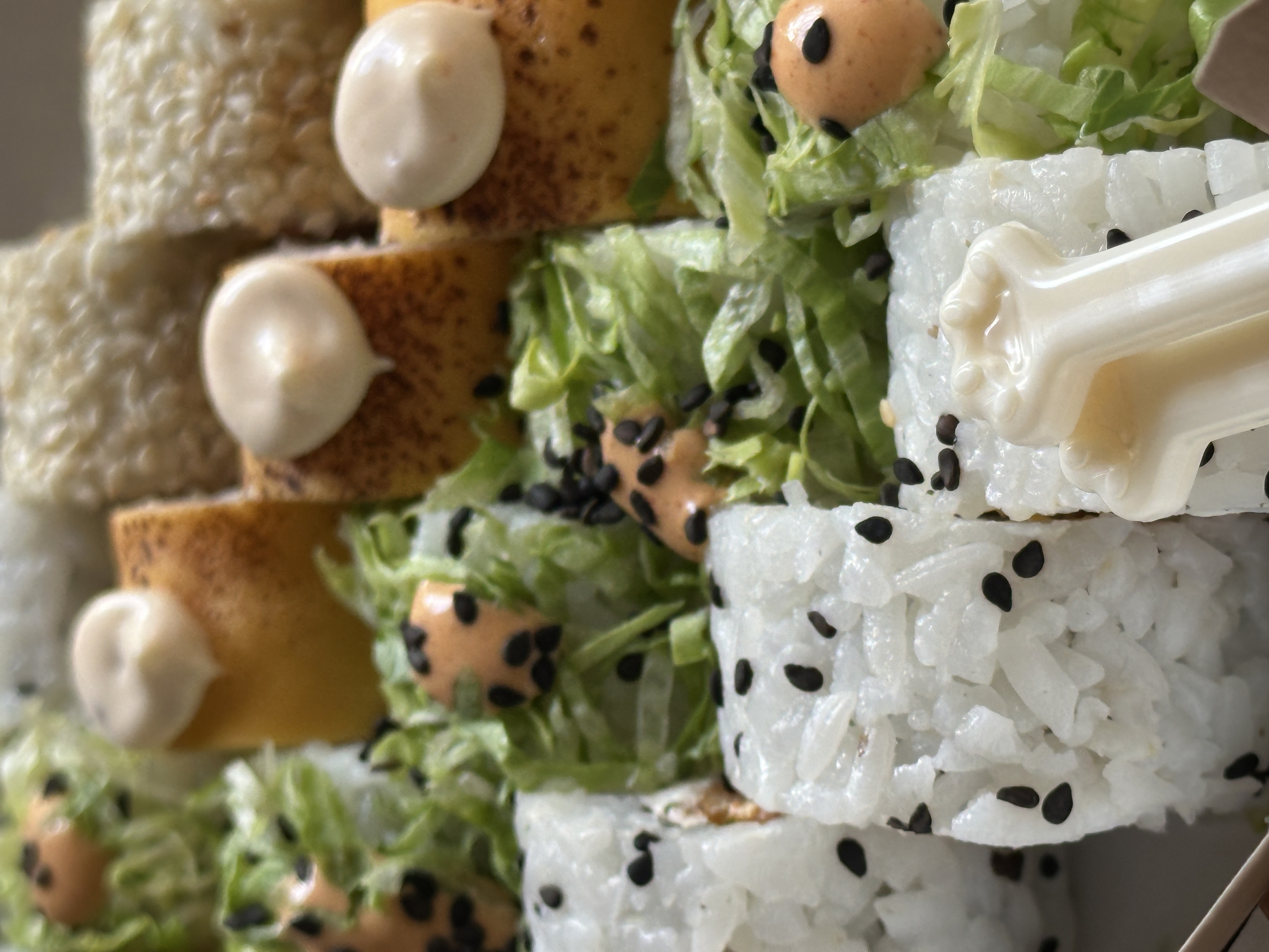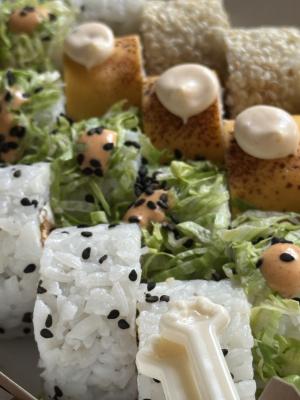 - ролл со сливочным сыром, жареным лососем, салатом айсбергом, соусом спайси, соусом фьюжен и кранч луком