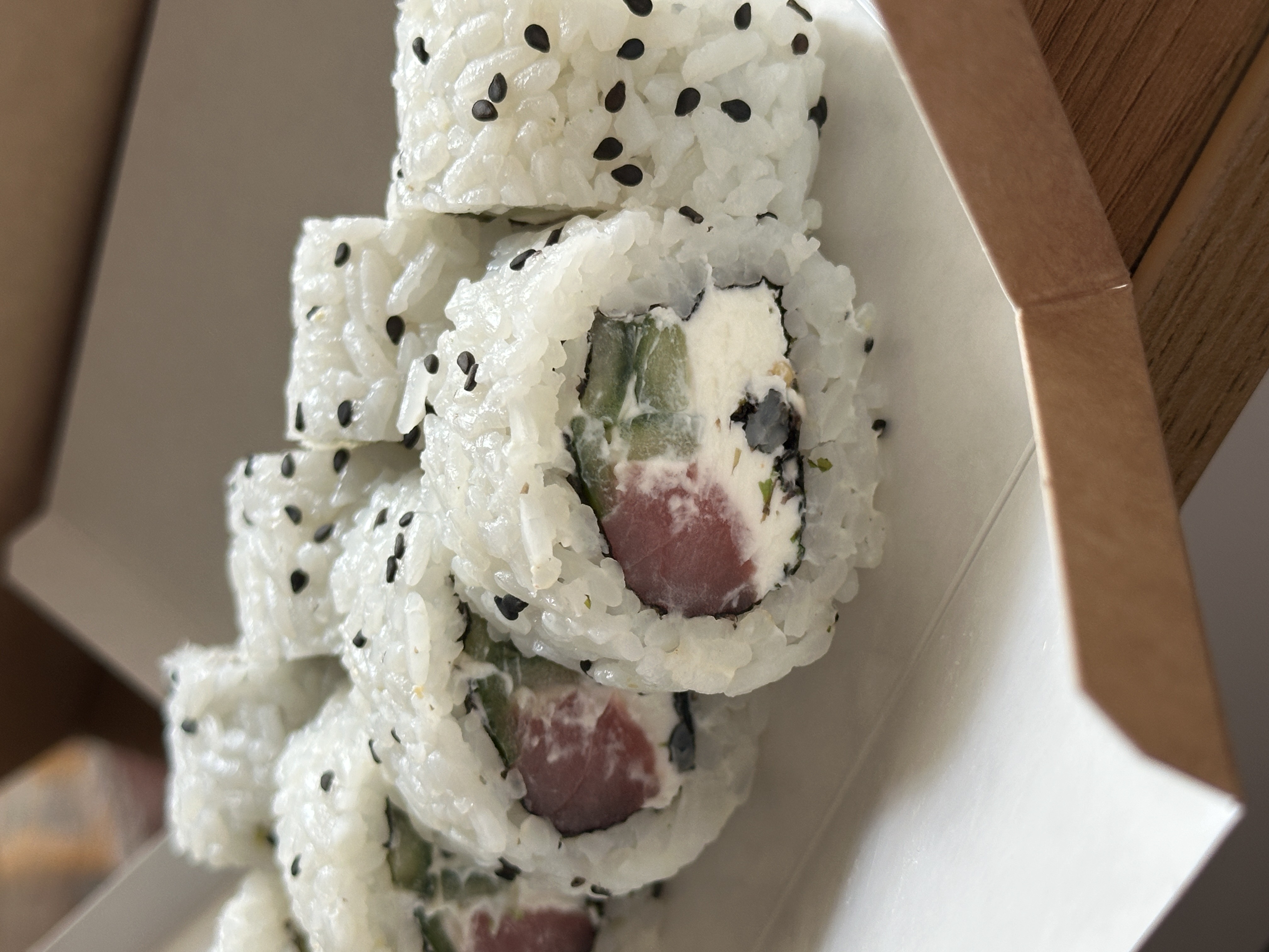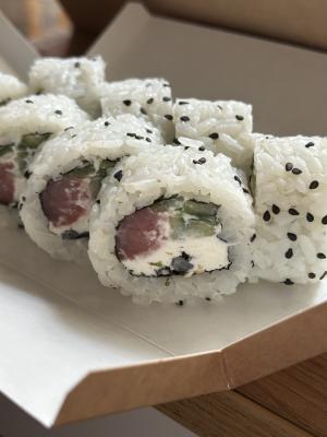 - ролл с тунцом, сливочным сыром, маринованными водорослями, соусом кунжутным, черным кунжутом