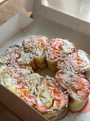 - ролл с морским окунем, сливочным сыром, айсбергом, яблоком и сладким соусом чили