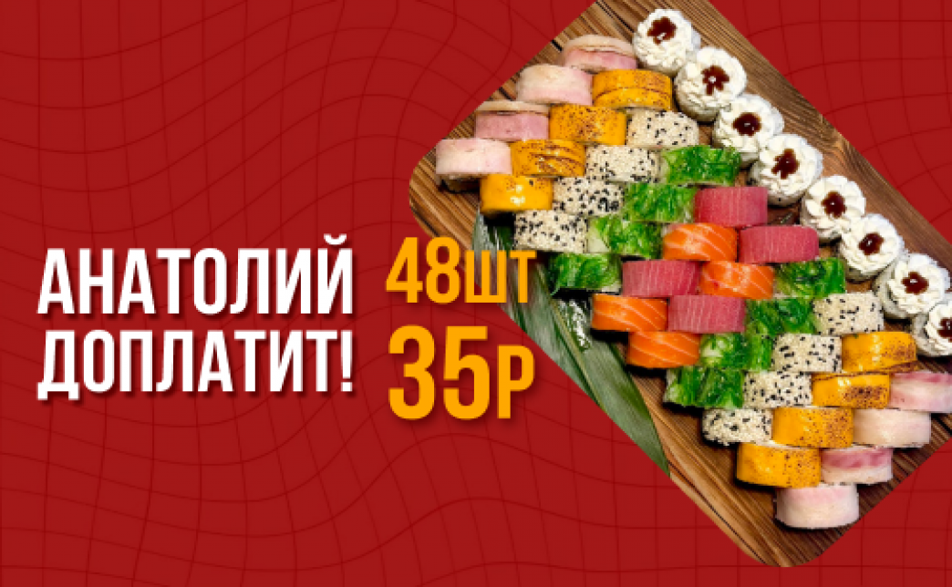 🔥 Фэст! Анатолий доплатит! Промокод дает право на скидку до 53% на сет "Анатолий доплатит!" от "THE СУШИ"