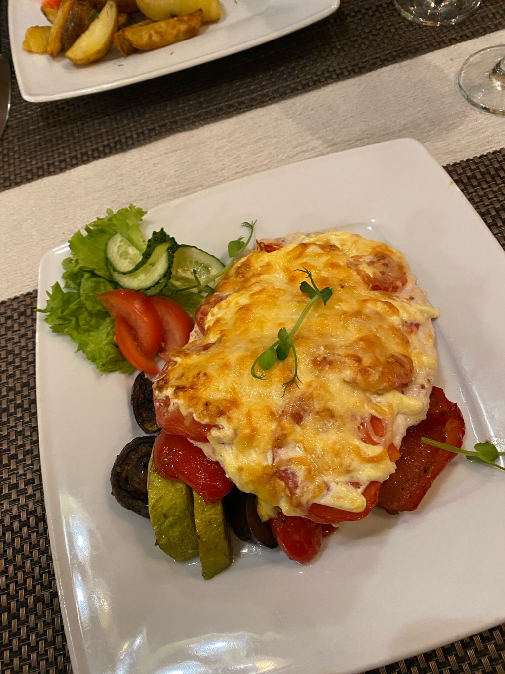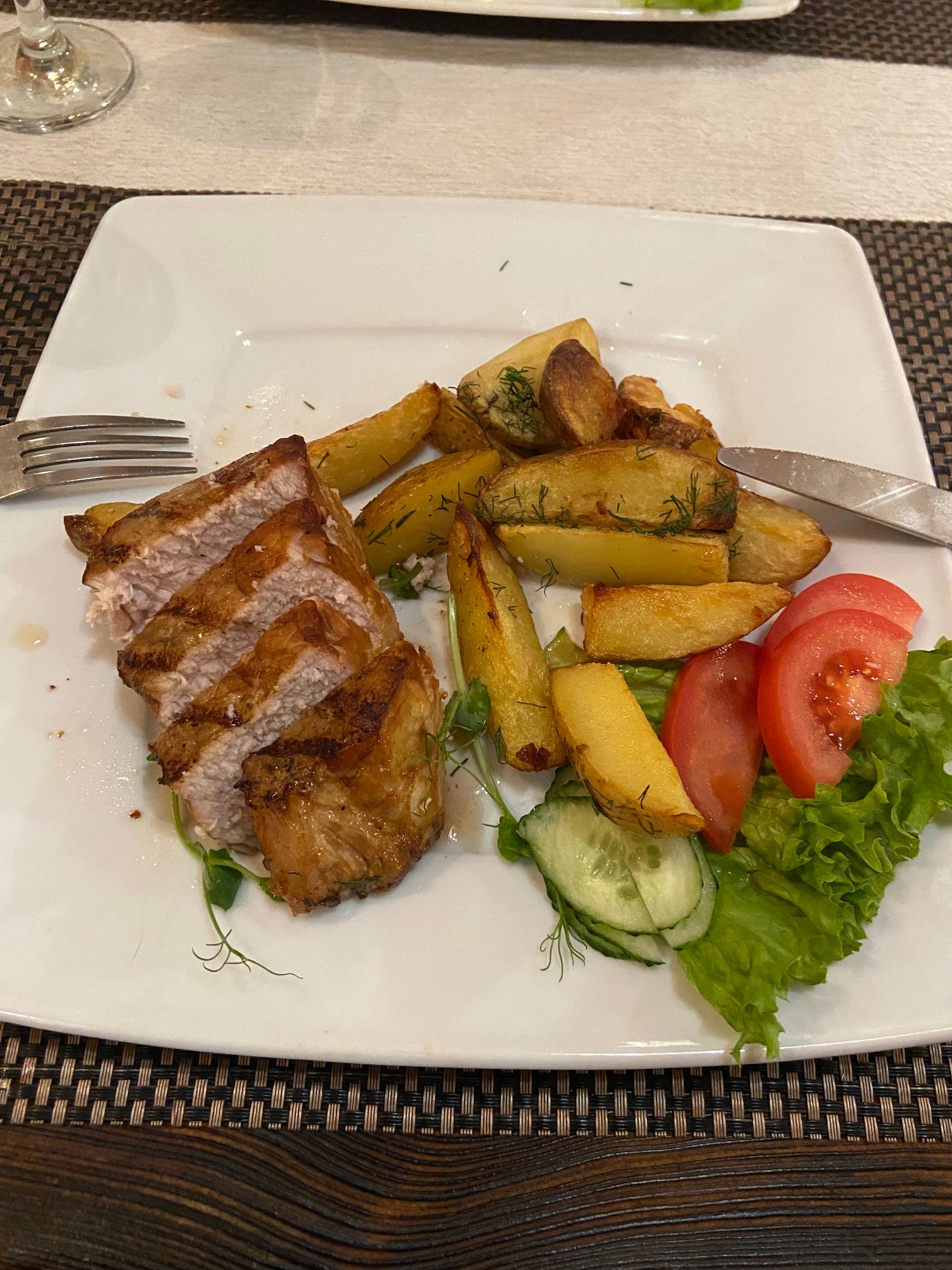 Салат "Греческий" (200 г) - 1 порция Салат "Фирменный" с говядиной (200 г) - 1 порция Филе куриное "Паночка" с овощами-гриль (380 г) - 1 порция Стейк из свинины с картофелем по-деревенски (300 г) - 1 порция Десерт (на выбор, 150 г) - 2 порции Игристый напиток (750 мл) |