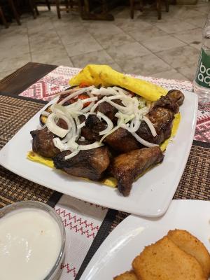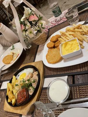 Салат "Цезарь с курицей" (200 г) - 1 порция Салат "Греческий" (200 г) - 1 порция Шипящая сковородка (330 г) - 1 порция Драники со сметаной (250 г) - 1 порция Десерт (на выбор, 150 г) - 2 порции |